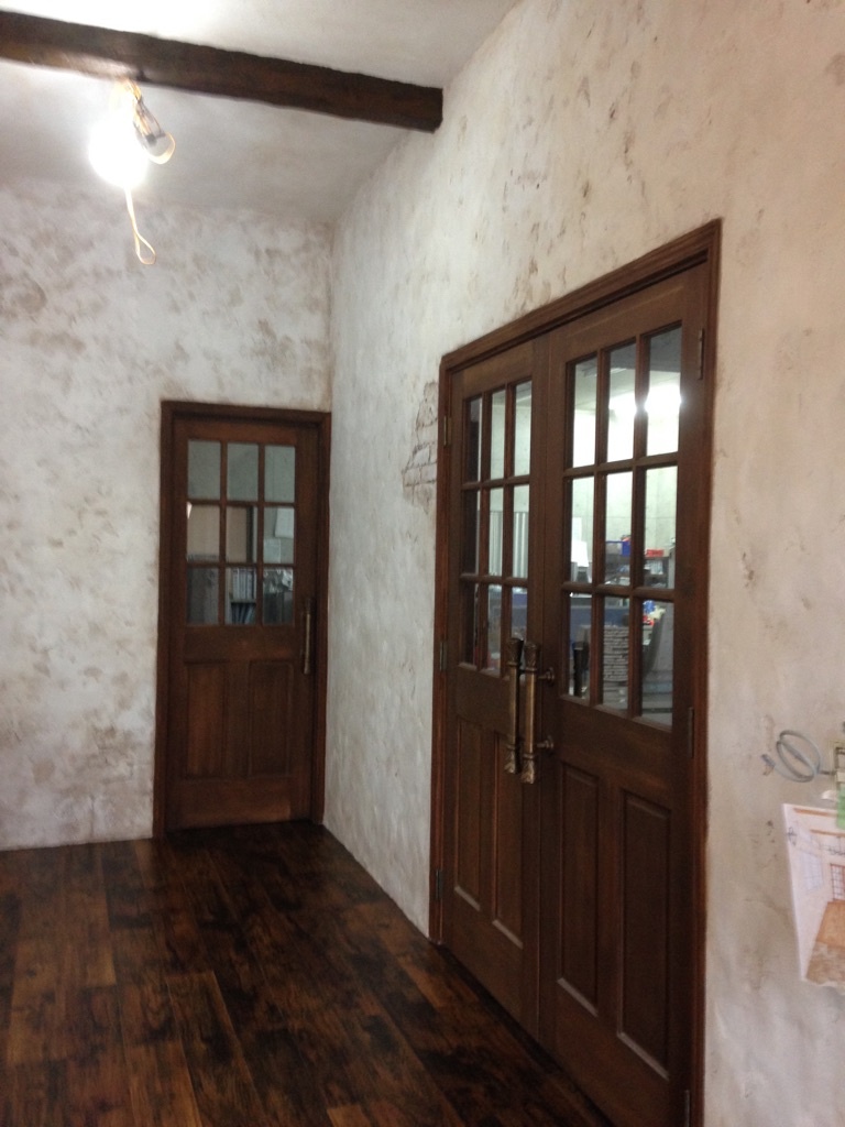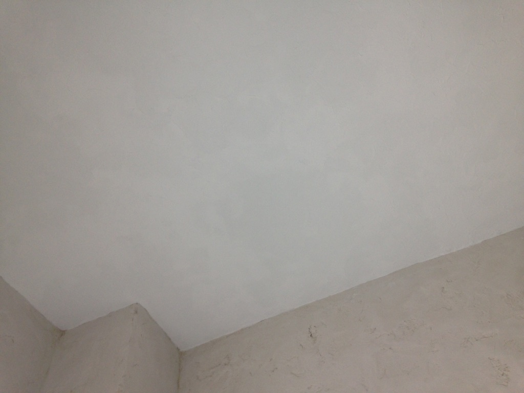 茶でウォッシュ(汚し)をかけた壁に白で色をおこします。 こうすることで凹の部分には茶が残り、凸の部分には白がのります。 これで白を基調とするアンティークな壁が出来上がります。 シンプルだけど奥深い色合い。ずっと眺めていたくなるような落ち着いた雰囲気。 これをミズムラは何年もこだわってきました。