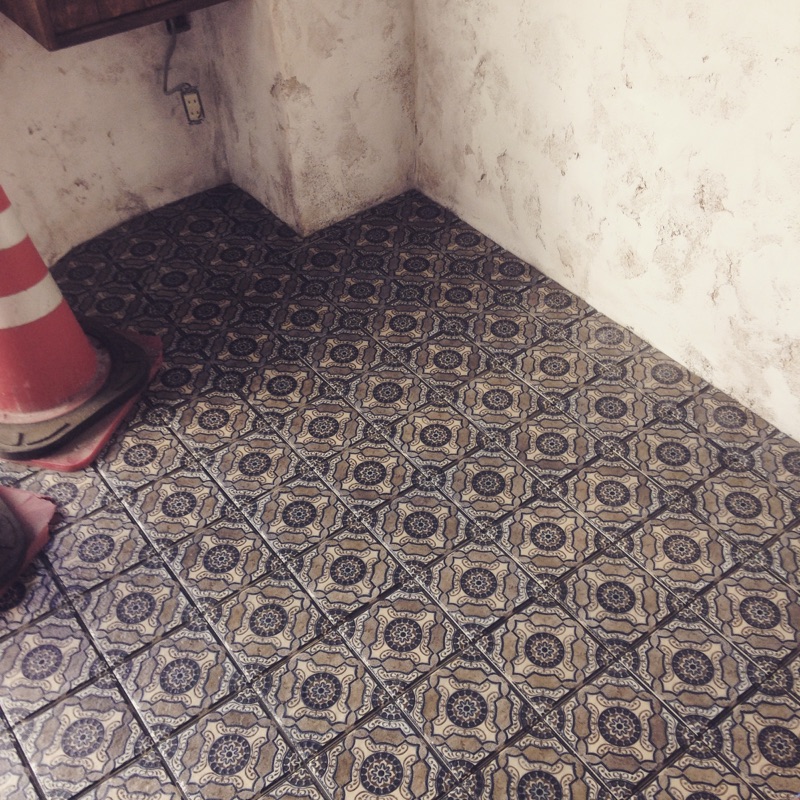 タイル屋ではありませんがタイル貼りです^^ タイル貼りも楽しいものです。 タイルはお客様ご用意していただいた 素敵な柄のタイルを使用しました^^ 個性的なタイルは見ていて飽きませんね。やっぱタイルはこうじゃなきゃ^^ね。 白いアンティークな壁ともマッチしてさらに空間が良くなりました★