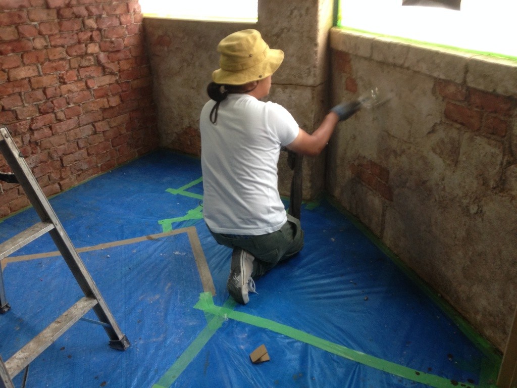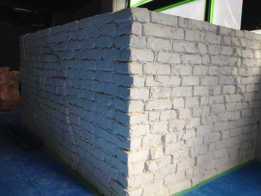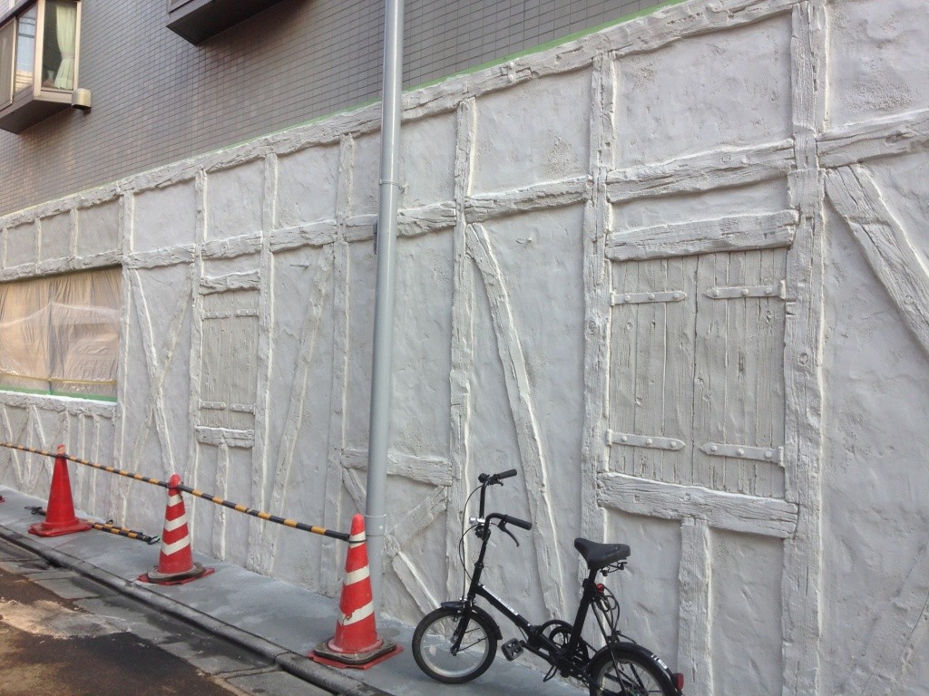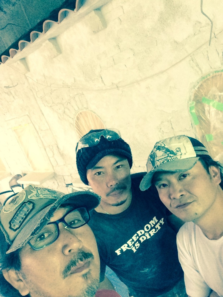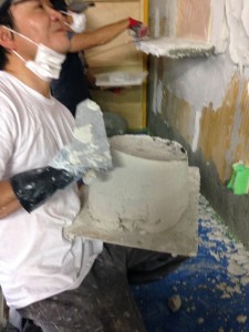 なんだかんだ言ってもやっぱ一番大変なのはモルタル・カービング。練って運んで塗りつけて削る。この繰り返し。全身真っ白になりながら。粉まみれになって。それでも頑張る。使った材料トータルで260袋。全て手練り。よく頑張りました。